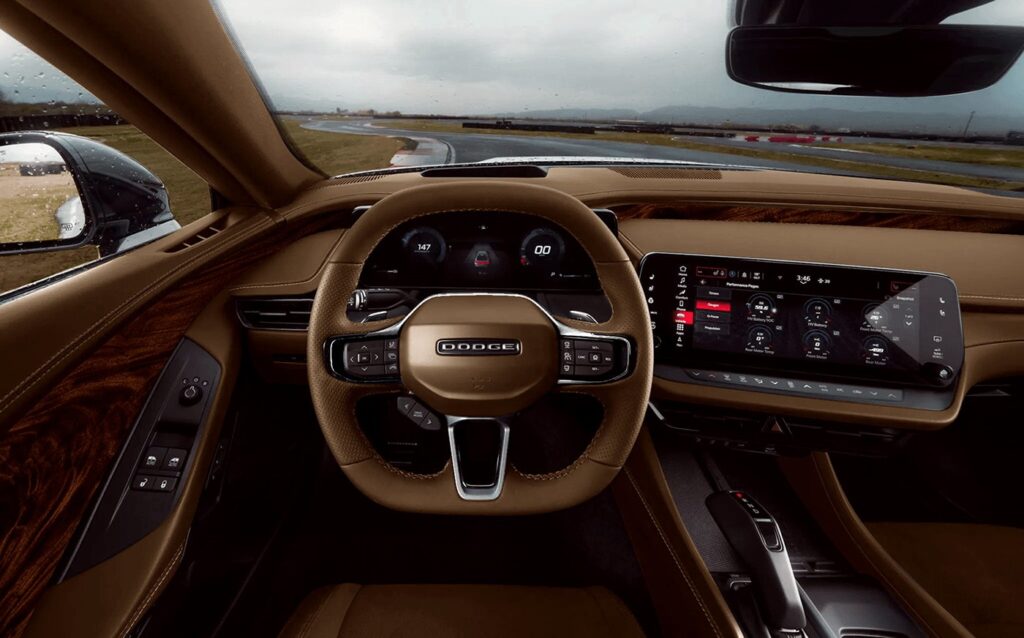 The cockpit mixes retro pistol-grip shifter vibes with high-tech luxury: a 12.3-inch digital cluster, 12.3-inch (or larger optional) touchscreen with Uconnect 5, premium materials, and available demonic red seats. Spacious for four (or five in four-door), it includes ample cargo and a front trunk (frunk).